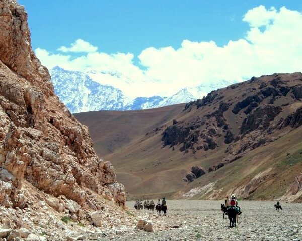 Montamos los caballos y empezamos la expedición a través de un paisaje fascinante y variado, sembrado de cactus. Durante el almuerzo, como los próximos días, ataremos los caballos y comeremos un sándwich al aire libre. Continuaremos ascendiendo por las montañas de aspecto semidesértico hasta Maitenes, donde montaremos nuestro primer campamento en los Andes. Cena abundante preparada en nuestra cocina de campo.