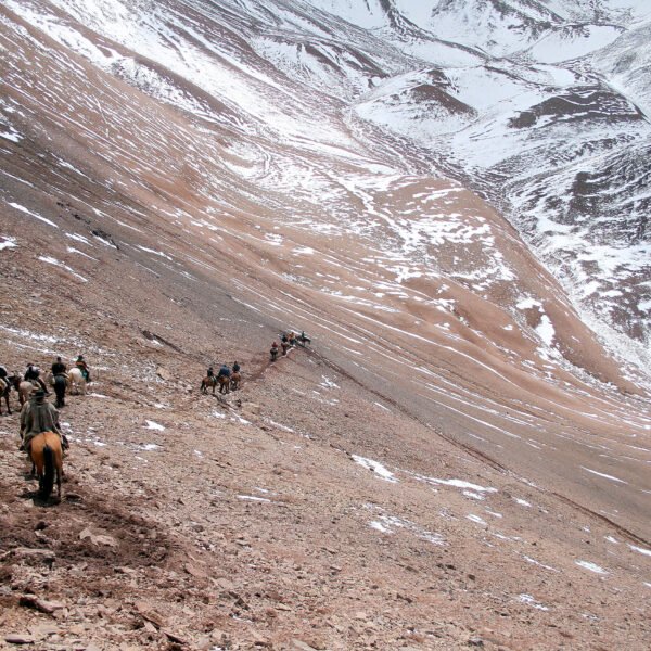 Durante 8 días, los jinetes atraviesan paisajes que van desde valles desolados hasta crestas vertiginosas, ríos salvajes y pasos ocultos en los altos Andes, viviendo la misma travesía que los conquistadores españoles hace 500 años. Todo permanece intacto: montañas, flora, fauna y la presencia majestuosa del cóndor, guanaco y puma.